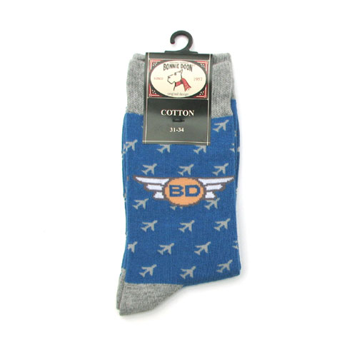 Blauwe jongenssokken van Bonnie Doon met ingebreid vliegtuigmotief.